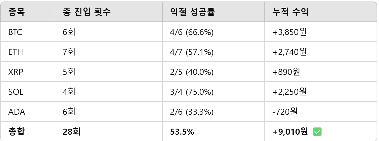 - 종목당 진입 자산: 약 10,000원 (전체 자산의 10%)